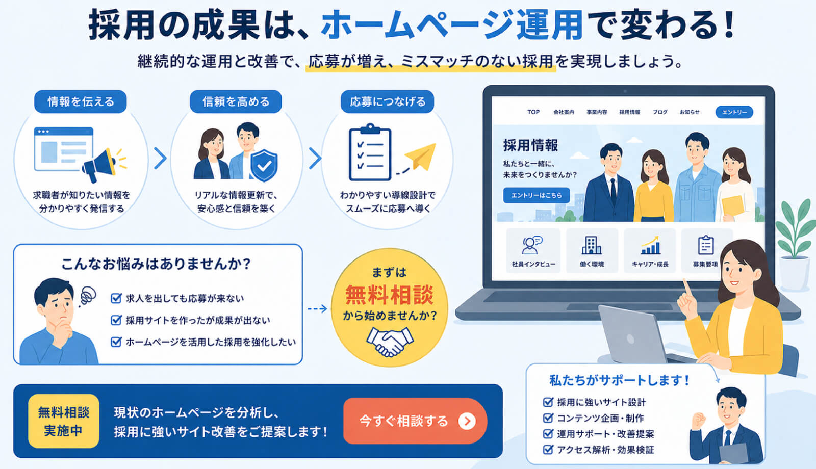 更新されていないサイト、情報が不足しているサイト、応募導線が弱いサイトでは、どれだけ良い人材に出会っても応募にはつながりません。