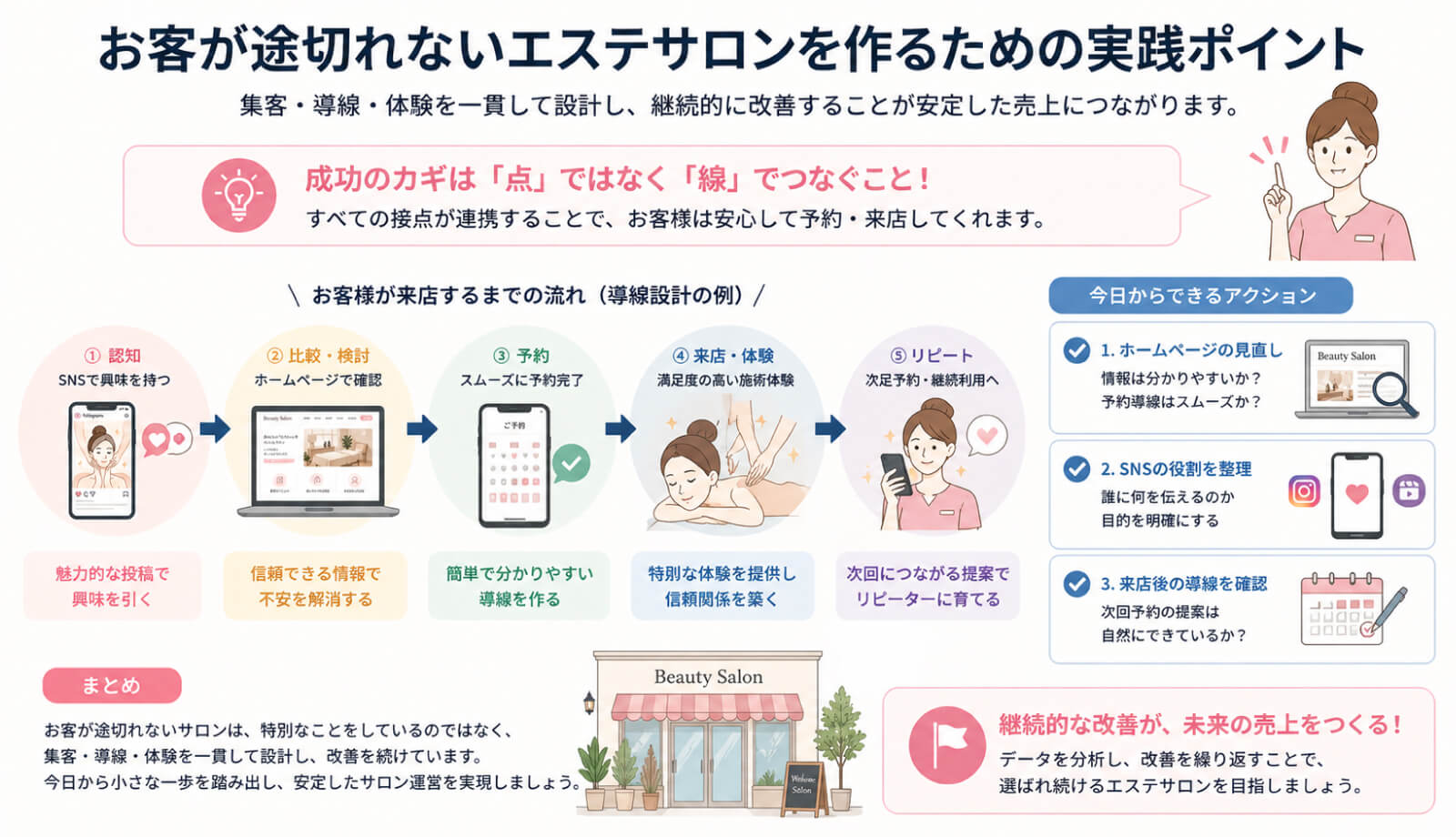 ここまで解説してきた内容を踏まえると、お客が途切れないエステサロンは「特別なことをしている」のではなく、「当たり前のことを戦略的に積み上げている」ことが分かります。